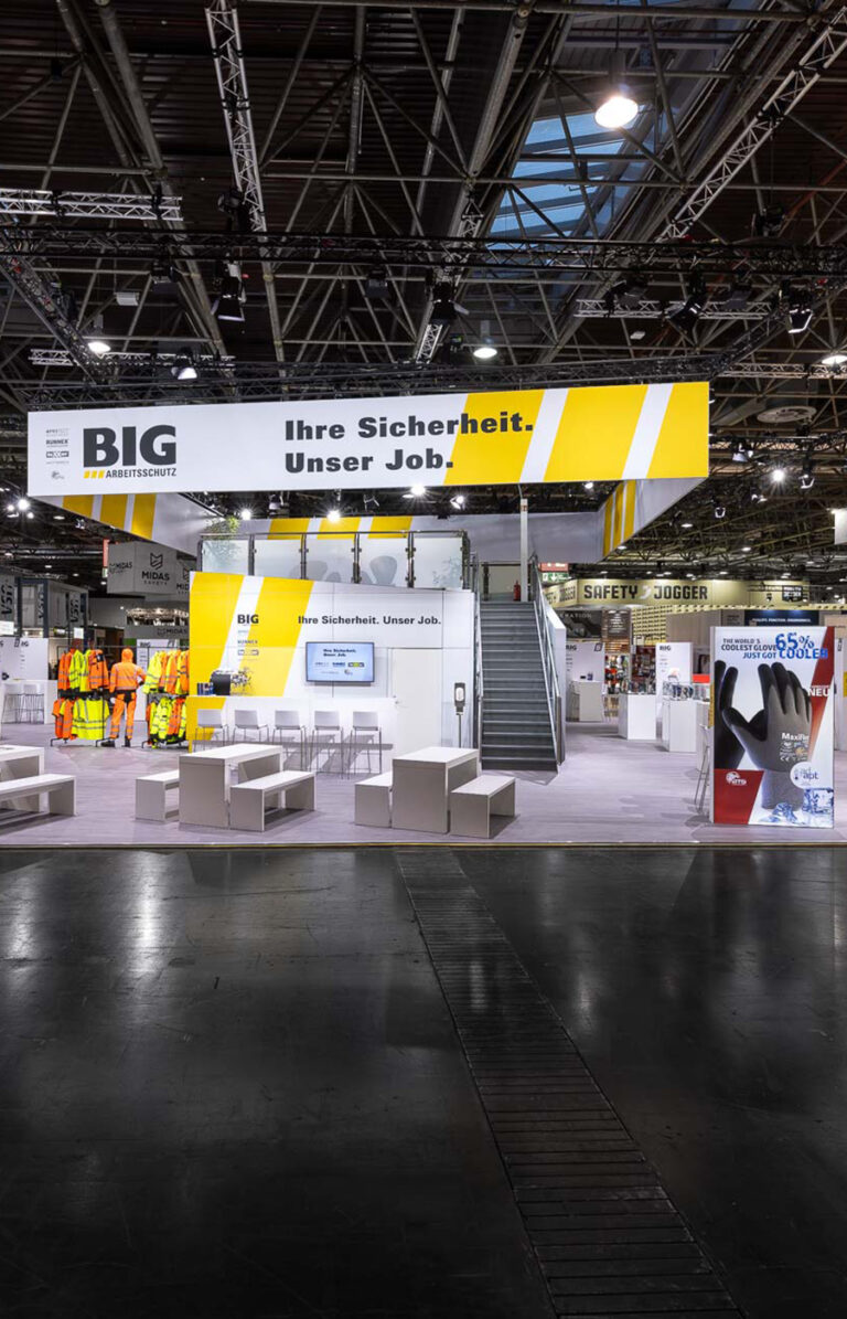In enger Zusammenarbeit mit unserem Kunden BIG Arbeitsschutz haben wir auch 2023 einen Messestand für die A+A geschaffen, der nicht nur auffällt, sondern in Erinnerung bleibt. Mit innovativem Design und kreativen Elementen realisierten wir eine Erlebniswelt, die weit über das reine Präsentieren von Produkten hinausgeht. Der Erfolg und das anerkennende Lob der Konkurrenz geben uns recht, dass es in der Welt der Messestände nicht nur um Präsenz geht, sondern auch um den bleibenden Eindruck.