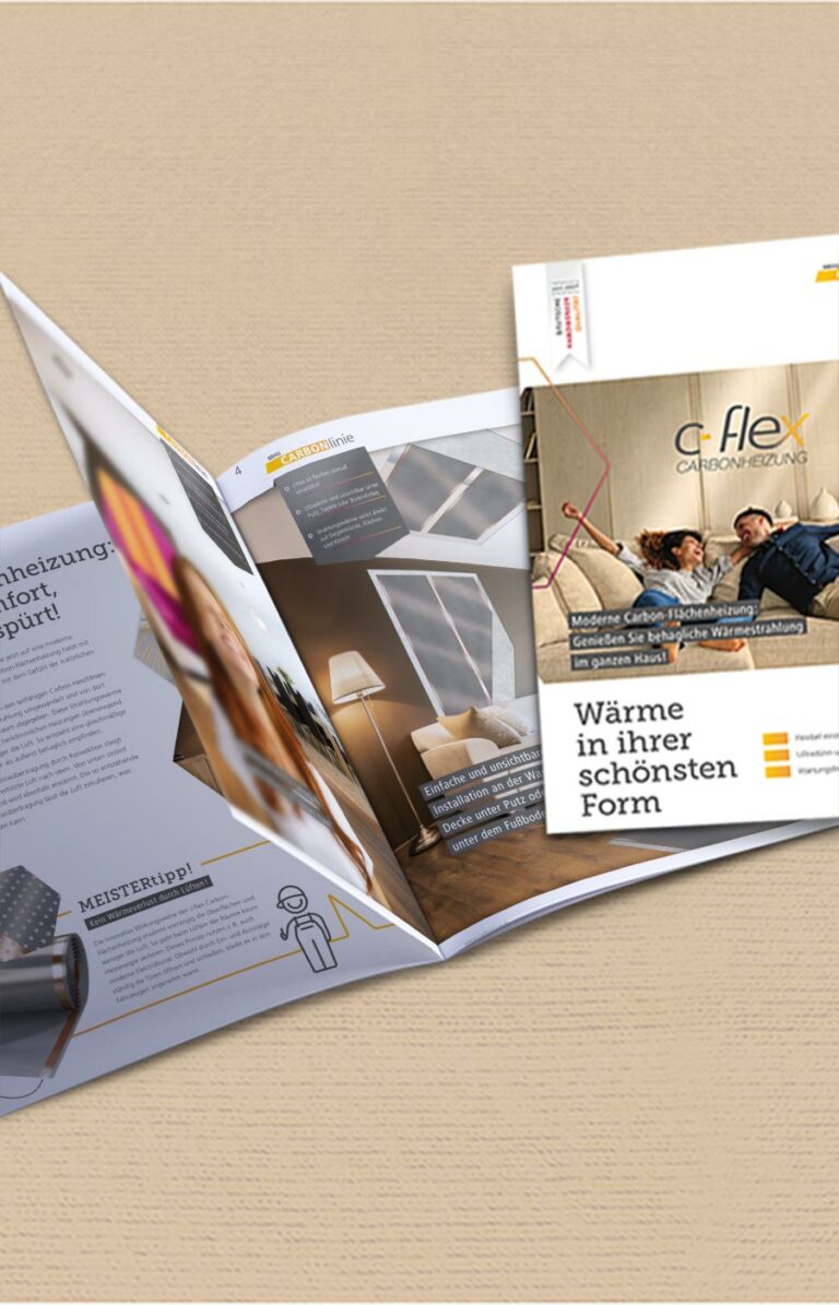 Unser Kunde MHG bringt mit der neuen c-flex Carbon-Flächenheizung eine neue, innovative Form des Heizens auf den Markt. Und wir bringen mit der gesamten visuellen Konzeption, inkl. Logo-Design, Website, 3D-Visualisierungen und Broschüren die richtige Portion Vorfreude auf wohlige Wärme in die Haushalte.